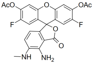 DAF-FM DA即4-Amino-5-Methylamino-2',7'-Difluorofluorescein Diacetate,也稱DAF-FM Diacetate,是最新一代用于一氧化氮(nitric oxide, NO)定量檢測的探針,其檢測原理為:DAF-FM DA可以穿過活細胞膜(cell-permeable),進入細胞后可以被胞漿內(nèi)的酯酶催化形成不能穿過細胞膜的DAF-FM。DAF-FM本身僅有很弱的熒光,光量子約0.005,但在與NO反應后生成熒光素-苯駢三氮唑(benzotriazole),發(fā)強烈綠色熒光,光量子約0.81。Ex~495 nm,Em~515 nm。任何可以檢測熒光素(fluorescein)的儀器,包括熒光顯微鏡、激光共聚焦顯微鏡、流式細胞儀、熒光分光光度計或熒光酶標儀都可以用于該熒光探針的檢測。